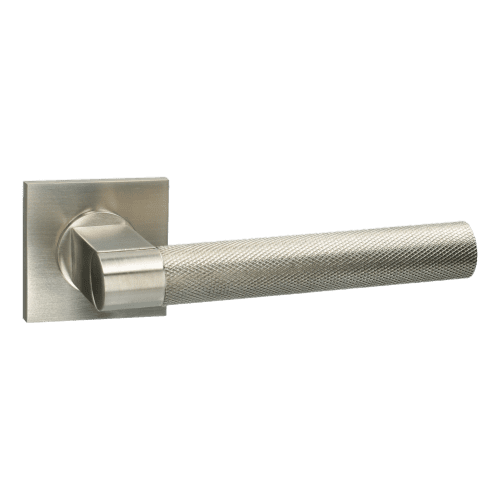 Le modèle Berlin, en laiton massif poli, monté sur une rosace carrée (ou ronde) dont le diamètre et le profil sont étudiés pour accompagner la ligne verticale et tendue de la béquille. En nickel mat satiné (finition 99), il est souvent selectionné pour les portes intérieures de projets tertiaires.
